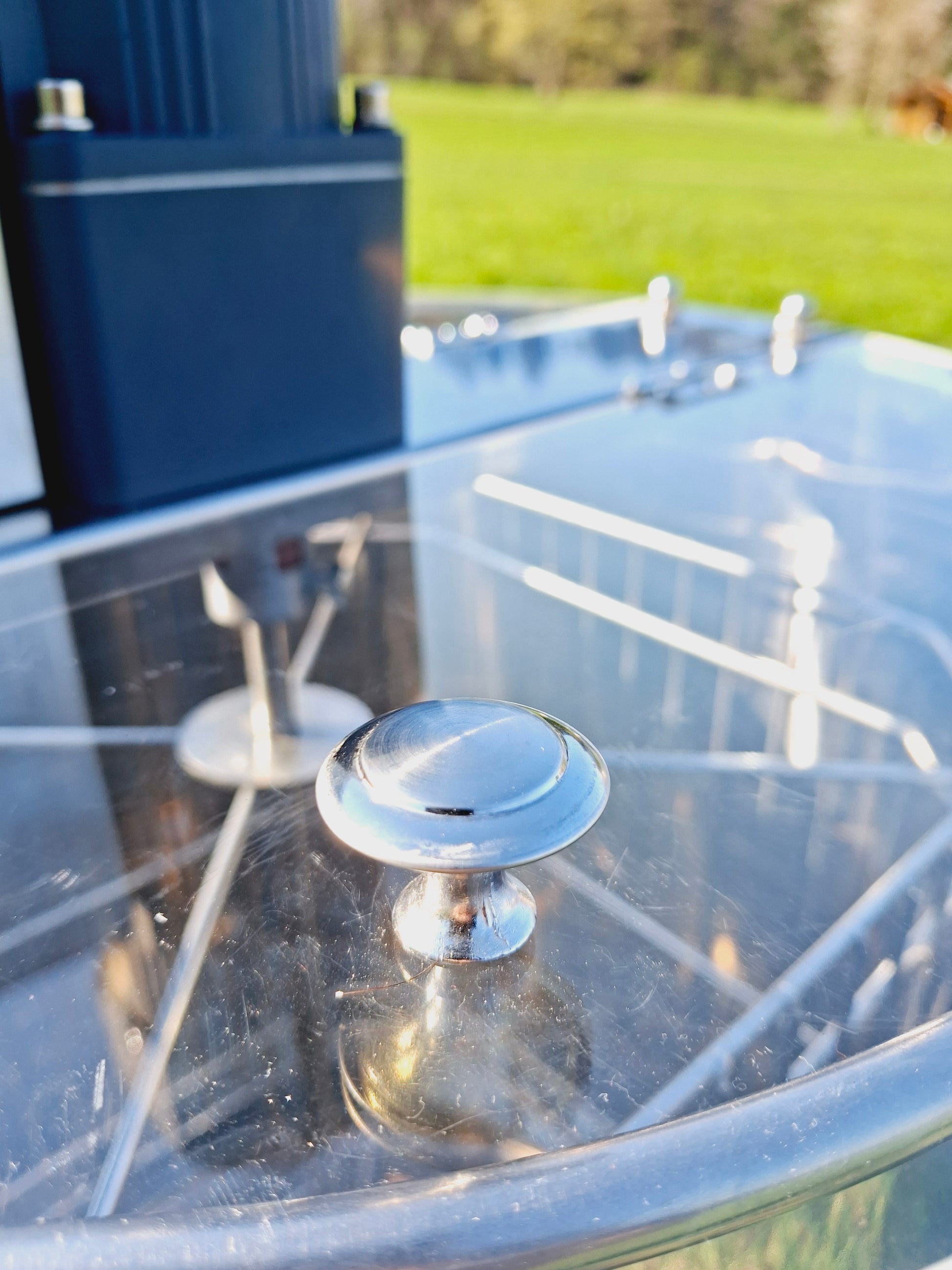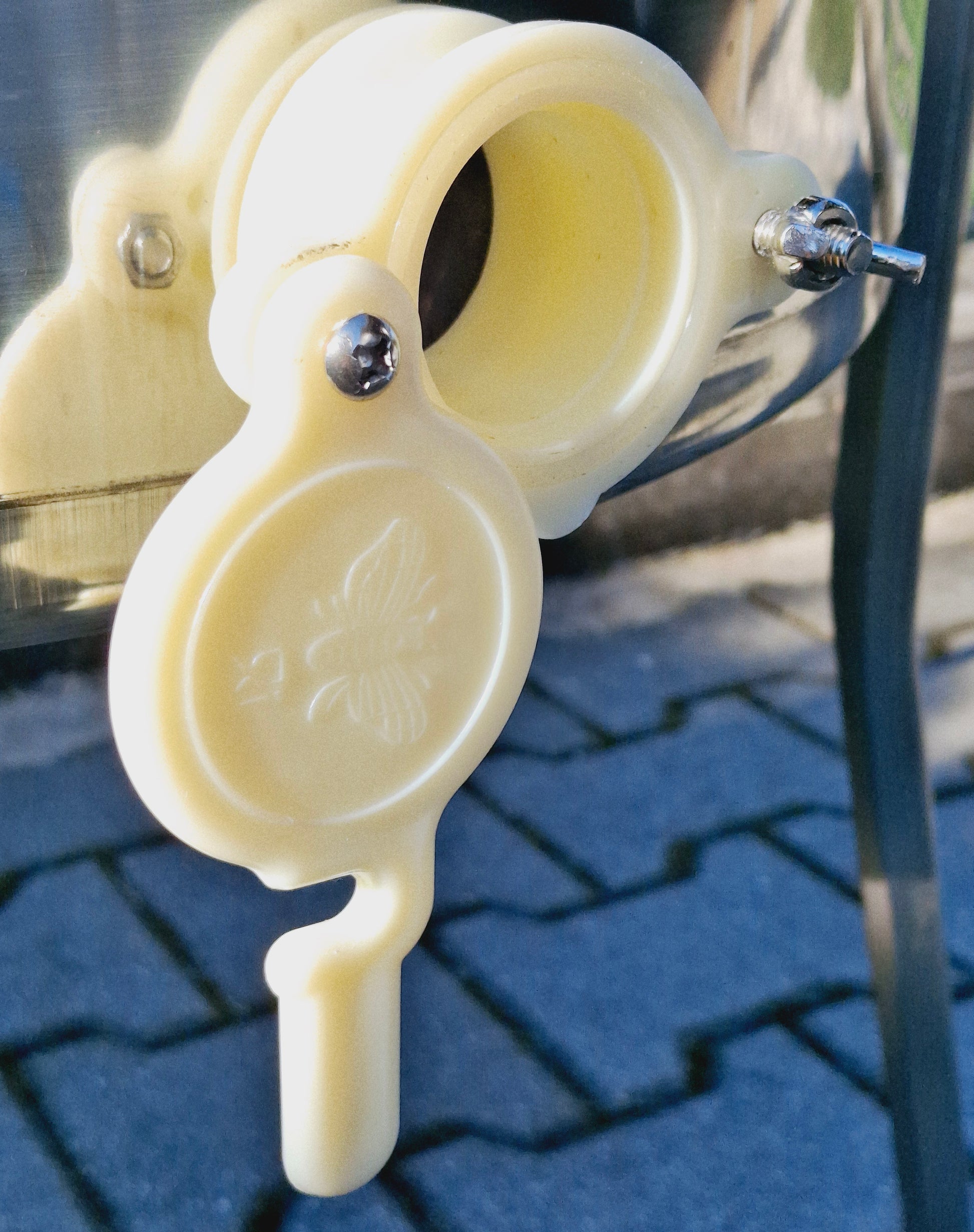 Premišljena zasnova zapore za med stoji približno 2,5 cm nad dnom soda, tako da lahko večino medu preprosto izvlečete iz vrtalke, ne da bi jo morali nagniti naprej. Poleg tega prozorno akrilno steklo na vrhu omogoča opazovanje procesa ožemanja in nastanek vpadanja prahu in drugih delcev med točenjem.